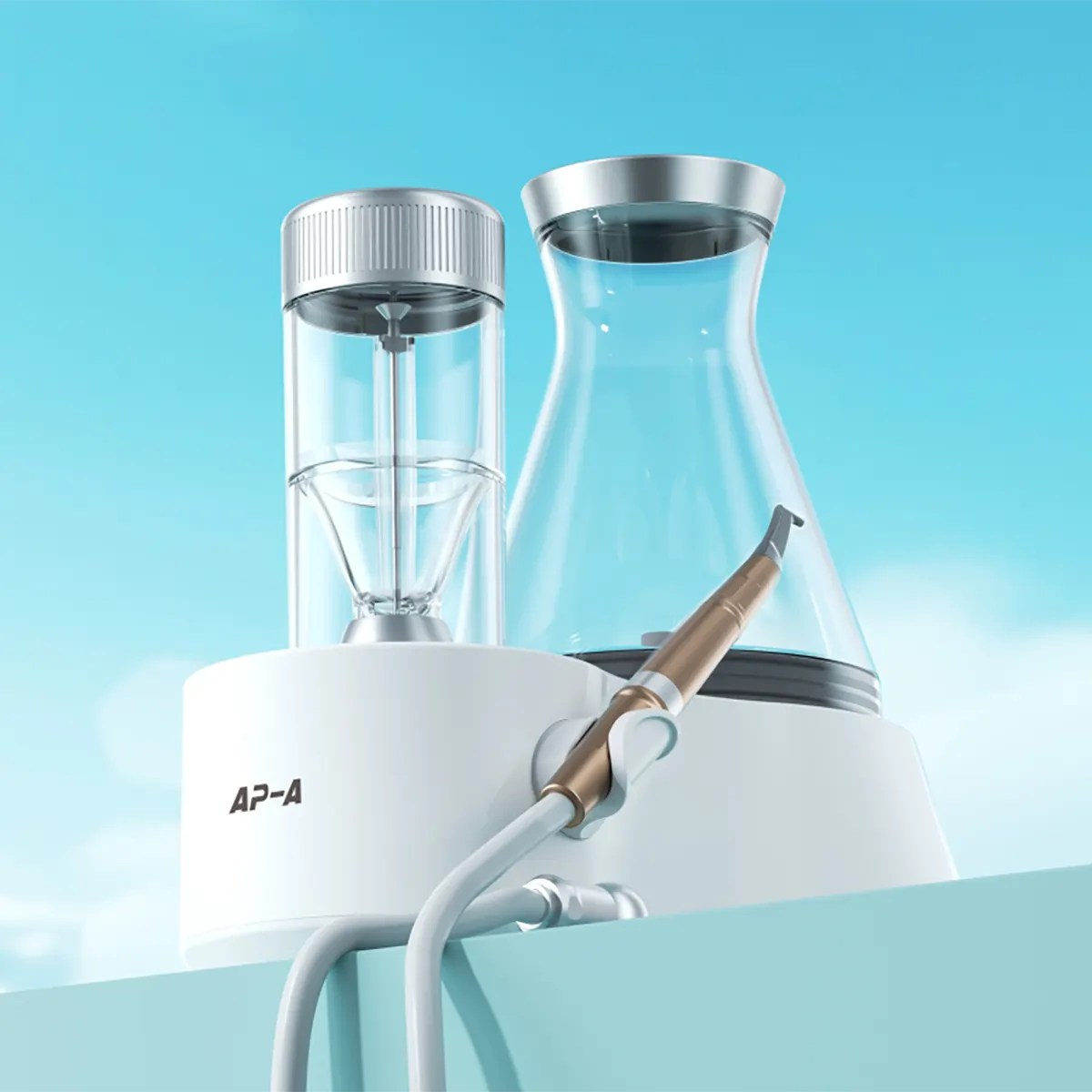 This system uses compressed air to spray a precise mixture of prophylaxis powder and water onto tooth surfaces, effectively removing dental plaque, pigment, and soft debris while maintaining implants . The AP-A features a fully transparent funnel-shaped powder tank that allows real-time monitoring of powder levels and ensures stable powder output .