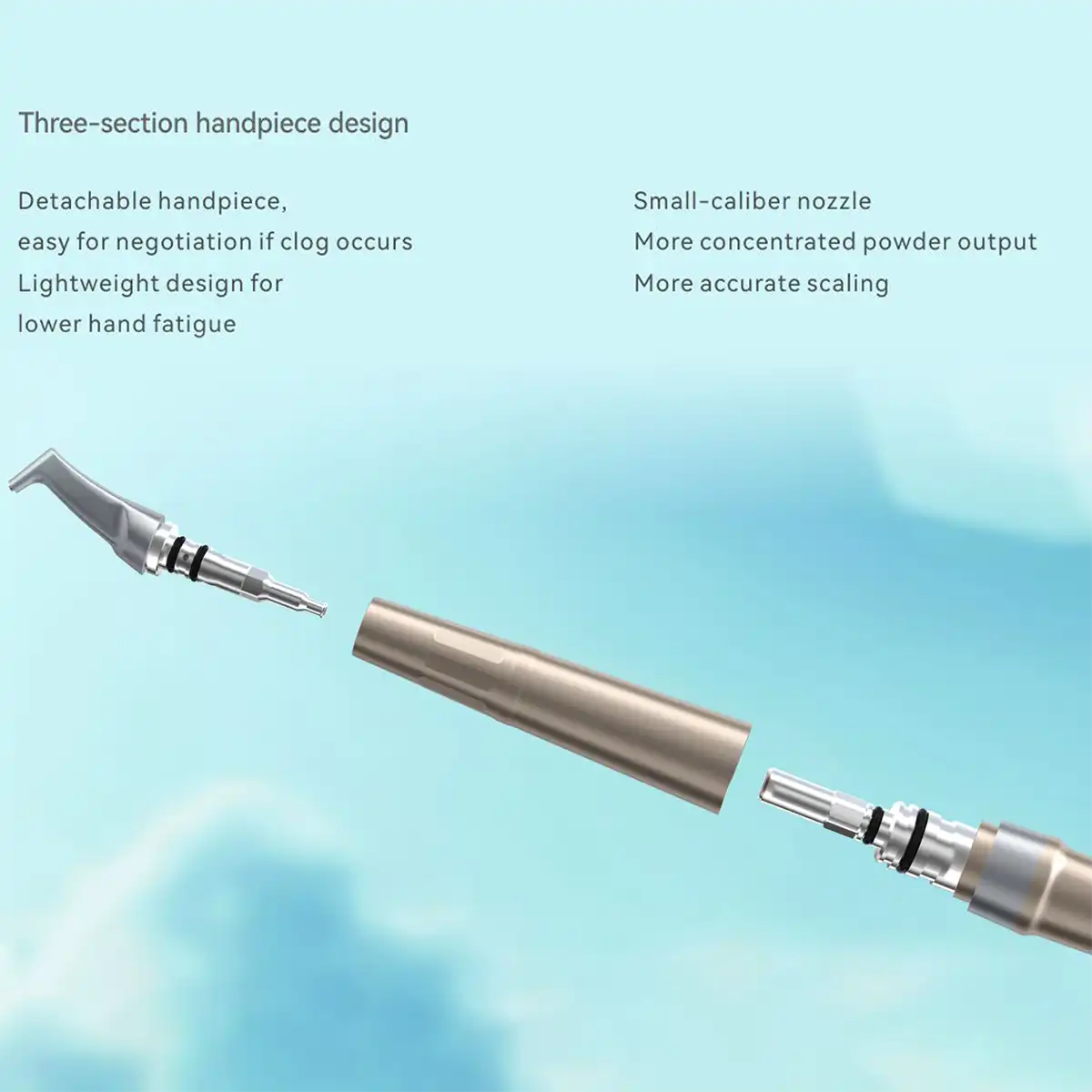 The handpiece is designed in three detachable sections, making it easy to clean and maintain while reducing powder clogging . The subgingival handpiece (AP-2) includes a 360° rotatable nozzle that can be pre-bent for optimal access to periodontal pockets, delivering three-direction powder output and one-direction water output for thorough biofilm elimination .